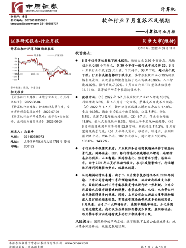 【中原证券】【20220911】计算机行业月报:软件行业7月复苏不及预期-18页 行业研究