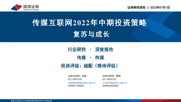 【国信证券】【20220701】传媒互联网行业2022年中期投资策略:复苏与成长-46页 行业研究