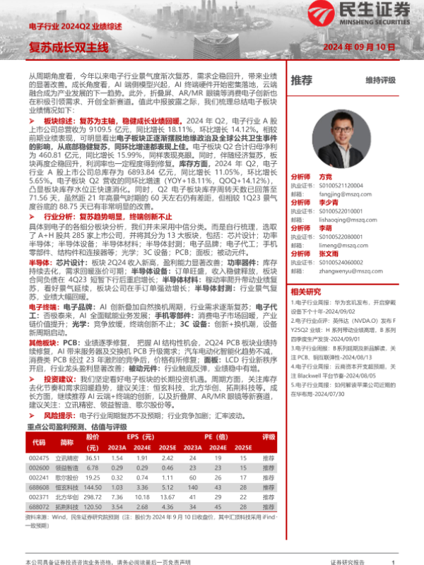 【民生证券】【20240910】电子行业2024Q2业绩综述:复苏成长双主线-30页 行业研究