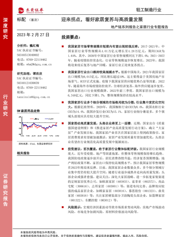 【东莞证券】【20230227】地产链系列报告之家居行业专题报告:迎来拐点,看好家居复苏与高质量发展-30页 行业研究