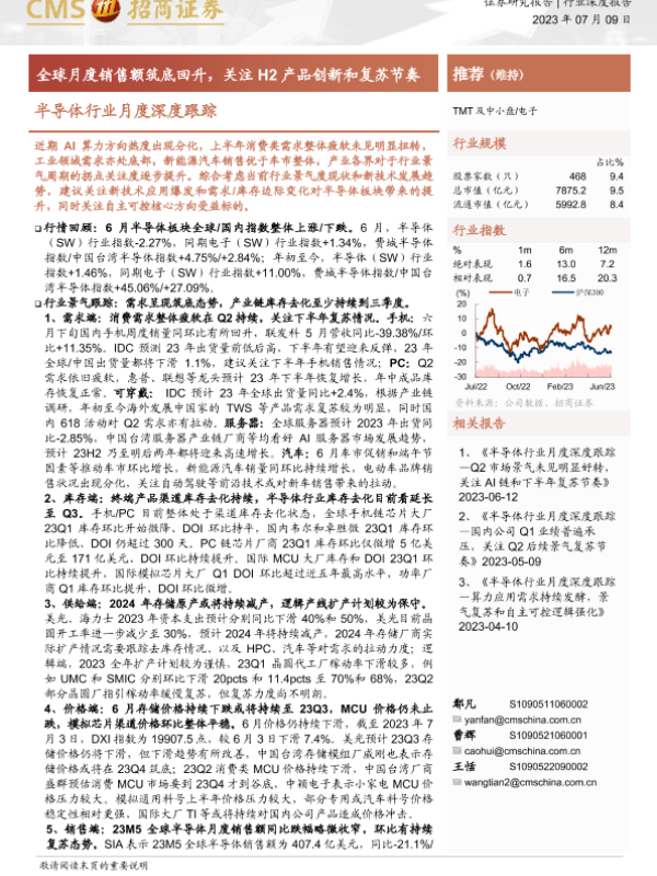 【海通证券】【20230709】20230709-招商证券-半导体行业月度深度跟踪:全球月度销售额筑底回升,关注H2产品创新和复苏节奏-71页 行业研究