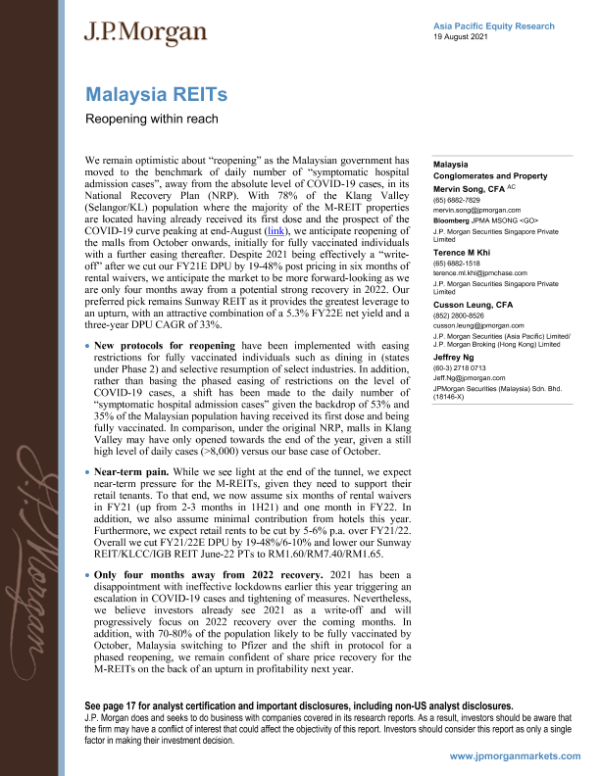 【J.P. Morgan】【20210819】马来西亚房地产信托基金:在触手可及的范围内重新开放-22页 行业研究