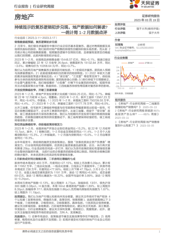 【天风证券】【20230319】房地产:统计局1-2月数据点评-持续提示的复苏逻辑初步兑现,地产数据如何解读?-21页 行业研究