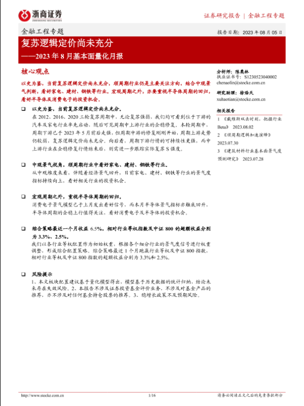 【浙商证券】【20230805】2023年8月基本面量化月报:复苏逻辑定价尚未充分-16页 行业研究