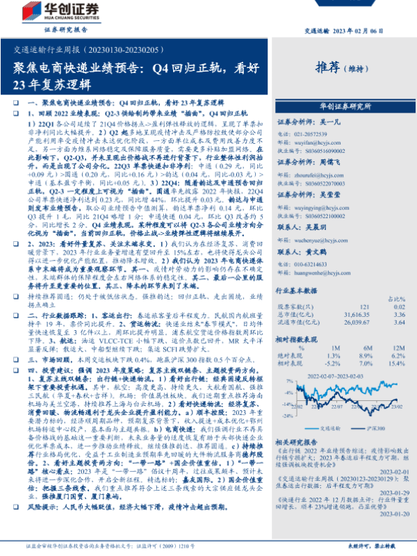 【华创证券】【20230206】交通运输行业周报:聚焦电商快递业绩预告:Q4回归正轨,看好23年复苏逻辑-24页 行业研究