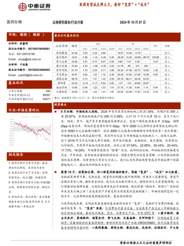 【中泰证券】【20241007】医药生物行业:医药有望成反弹主力,看好“复苏”+“成长”-16页 行业研究