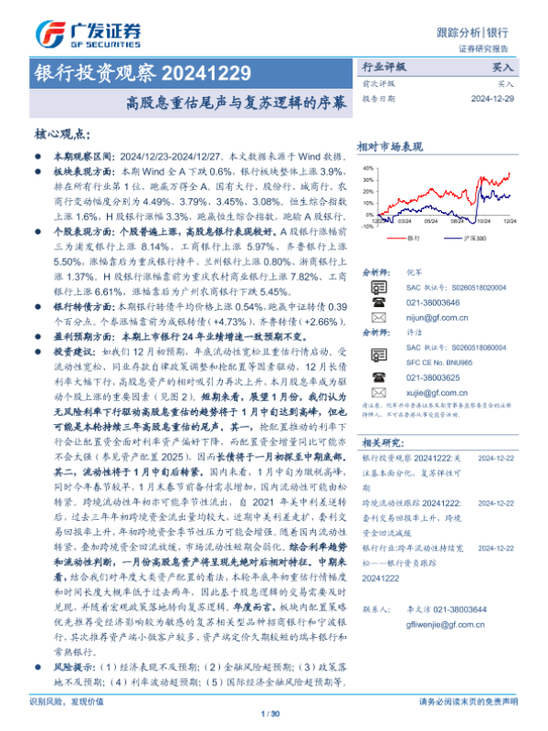 【广发证券】【20241229】银行业投资观察:高股息重估尾声与复苏逻辑的序幕-30页 行业研究