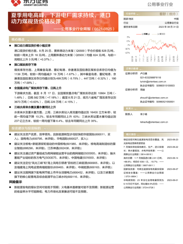 【东方证券】【20230831】公用事业行业周报:夏季用电高峰,下游电厂需求持续,港口动力煤现货价格反弹-19页 行业研究