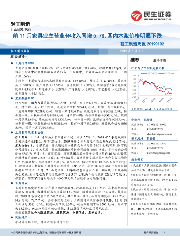 【民生证券】【20190102】20190102-民生证券-轻工制造周报:前11月家具业主营业务收入同增5.7%,国内木浆价格明显下跌-17页 行业研究