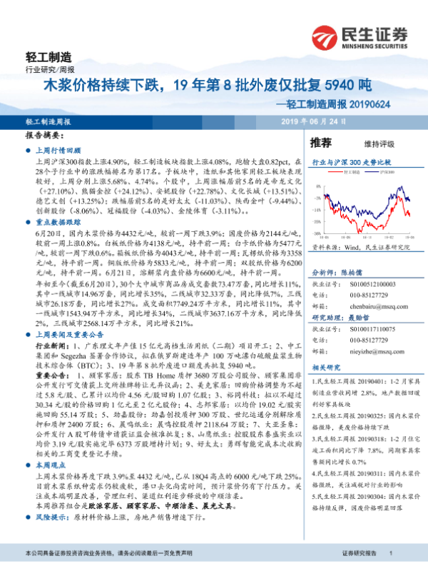 【民生证券】【20190624】20190624-民生证券-轻工制造周报:木浆价格持续下跌,19年第8批外废仅批复5940吨-17页 行业研究