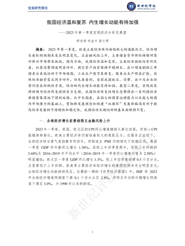 【新世纪评级】【20230401】我国经济温和复苏 内生增长动能有待加强——2023年第一季度宏观经济分析及展望-14页 行业研究