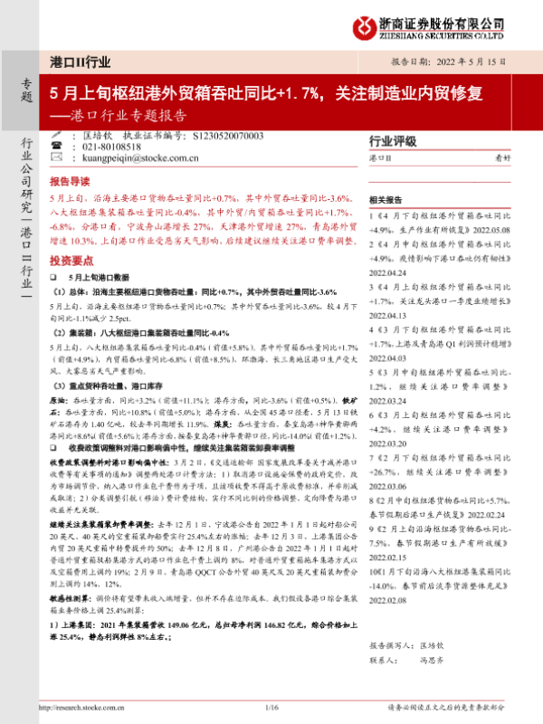 【浙商证券】【20220515】5月上旬枢纽港外贸箱吞吐同比+1.7%,关注制造业内贸修复-16页 行业研究