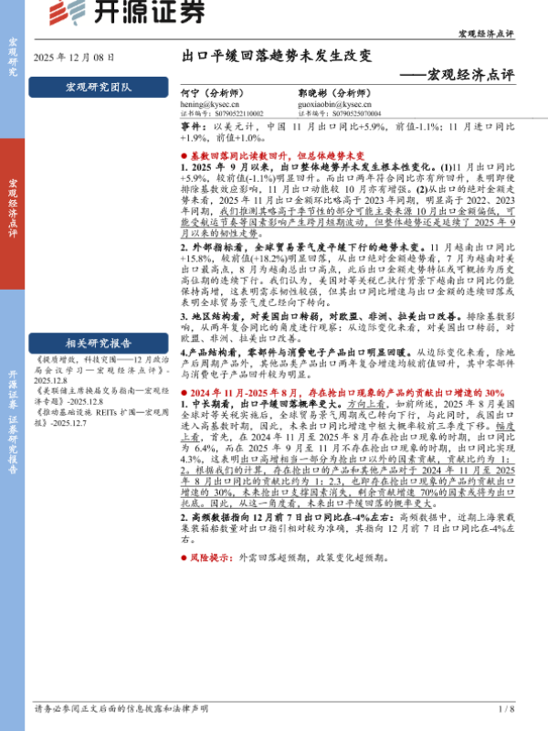 【开源证券】【202512】出口平缓回落趋势未发生改变-8页 证券期货研究报告