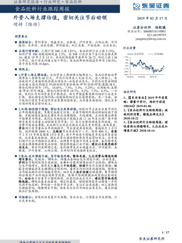 【东吴证券】【20190217】食品饮料行业跟踪周报:外资入场支撑估值,密切关注节后动销-17页 行业研究