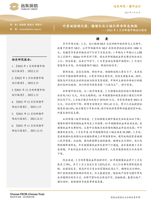 【远东资信】【20220314】2022年2月利率债市场运行报告:外资减持境内债,稳增长压力强化降准降息预期-18页 行业研究