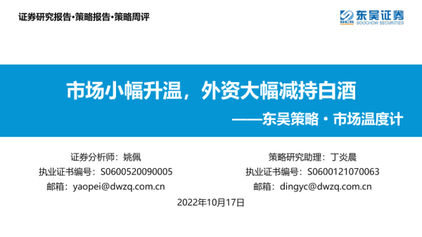 【东吴证券】【20221017】东吴策略·市场温度计:市场小幅升温,外资大幅减持白酒-26页 行业研究