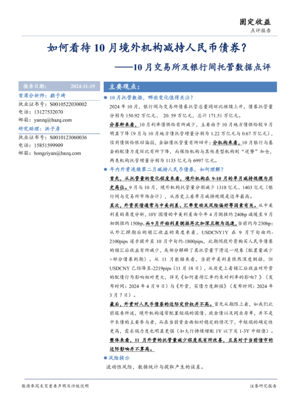 【华安证券】【20241119】10月交易所及银行间托管数据点评:如何看待10月境外机构减持人民币债券?-16页 行业研究