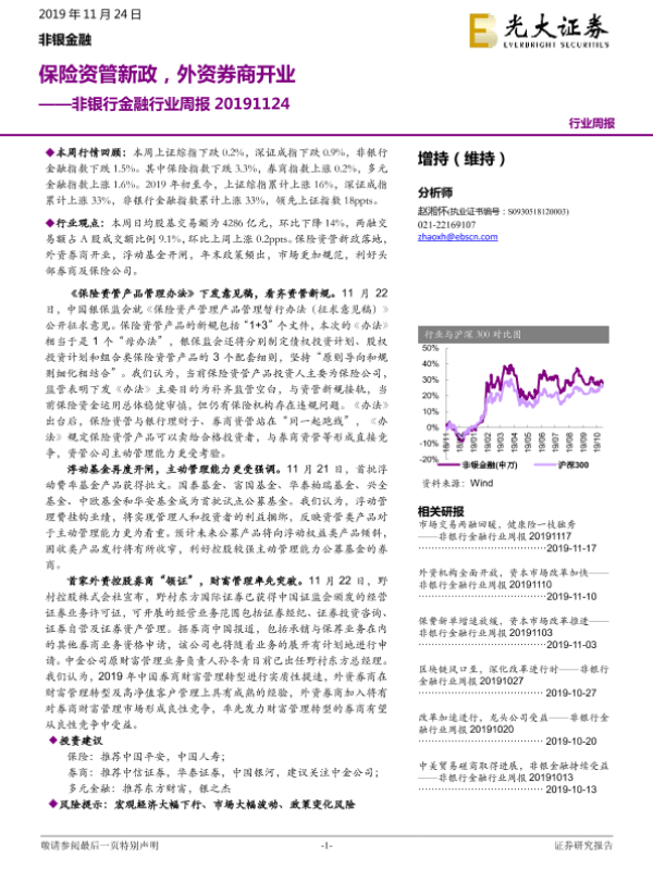 【光大证券】【20191124】非银行金融行业周报:保险资管新政,外资券商开业-12页 行业研究