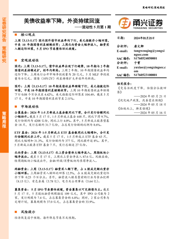 【甬兴证券】【20240525】流动性5月第1期:美债收益率下降,外资持续回流-11页 行业研究