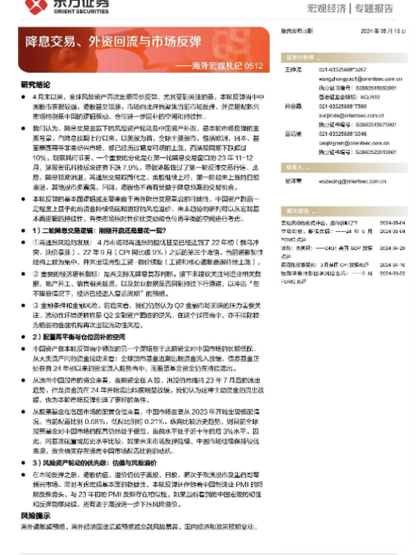 【东方证券】【20240513】海外宏观札记0512:降息交易、外资回流与市场反弹-15页 行业研究