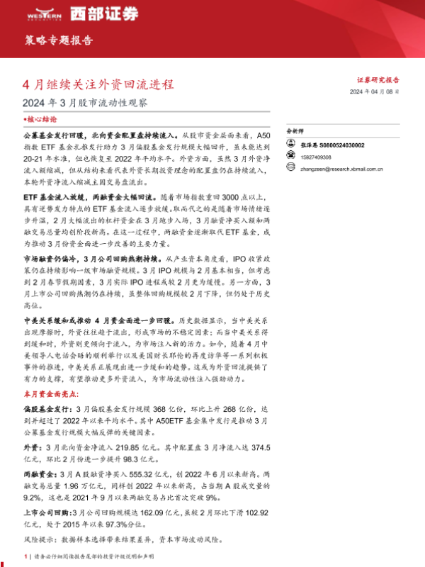 【西部证券】【20240408】2024年3月股市流动性观察:4月继续关注外资回流进程-19页 行业研究