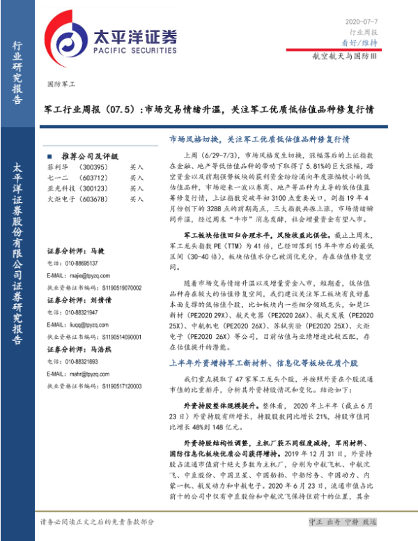 【太平洋证券】【20200628】军工行业周报(06.28):上半年外资增持军工新材料、信息化等板块优质个股-14页 行业研究