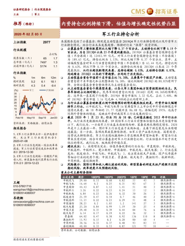 【海通证券】【20200203】20200203-招商证券-军工行业持仓分析:内资持仓比例持续下滑,估值与增长确定性优势凸显-16页 行业研究