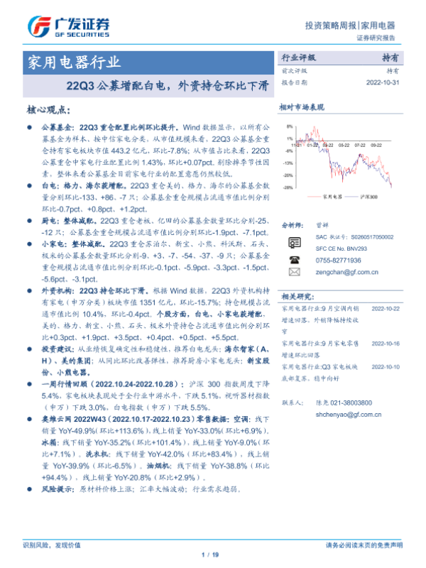 【广发证券】【20221031】22Q3公募增配白电,外资持仓环比下滑-19页 行业研究