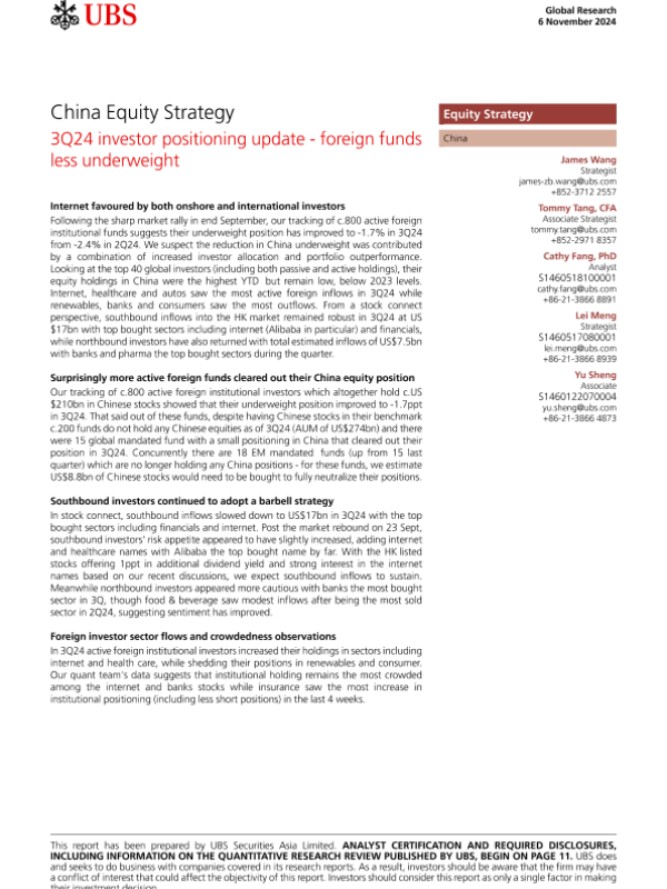 【UBS Securities Asia Limited】【20241106】es-China Equity Strategy _3Q24 investor positioning update-15页 行业研究
