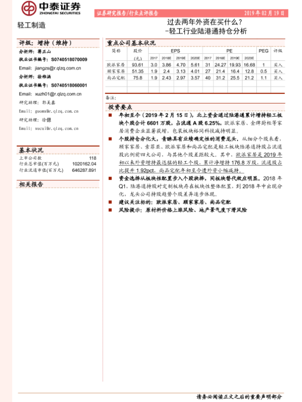 【中泰证券】【20190219】轻工行业陆港通持仓分析:过去两年外资在买什么?-7页 行业研究