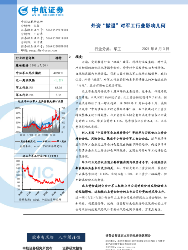【中航证券】【20210803】外资“撤退”对军工行业影响几何-20页 行业研究