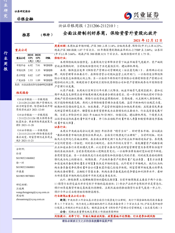 【兴业证券】【20211212】兴证非银周报:全面注册制利好券商,保险资管外资股比放开-15页 行业研究