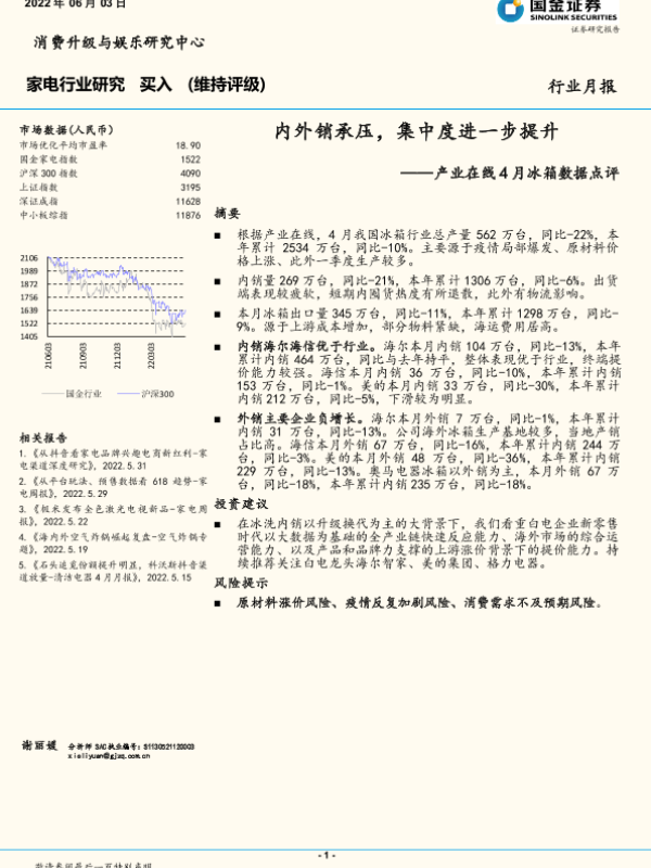 【国金证券】【20220603】产业在线4月冰箱数据点评:内外销承压,集中度进一步提升-6页 行业研究