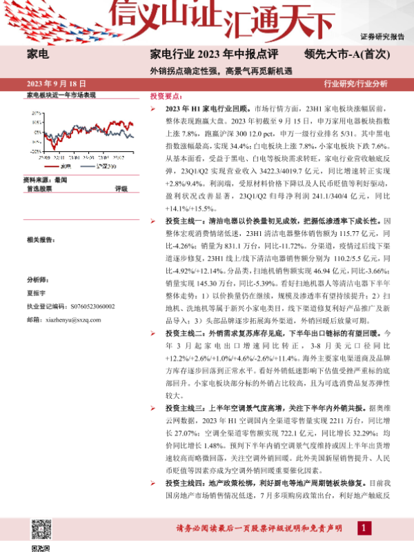 【山西证券】【20230918】家电行业2023年中报点评:外销拐点确定性强,高景气再觅新机遇-33页 行业研究