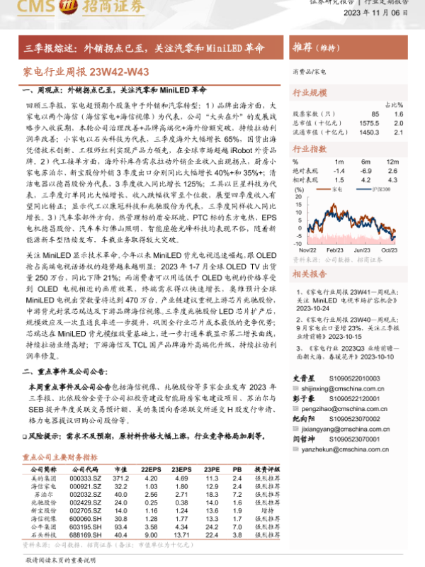 【海通证券】【20231106】家电行业周报23W42-W43:三季报综述:外销拐点已至,关注汽零和MiniLED革命-13页 行业研究