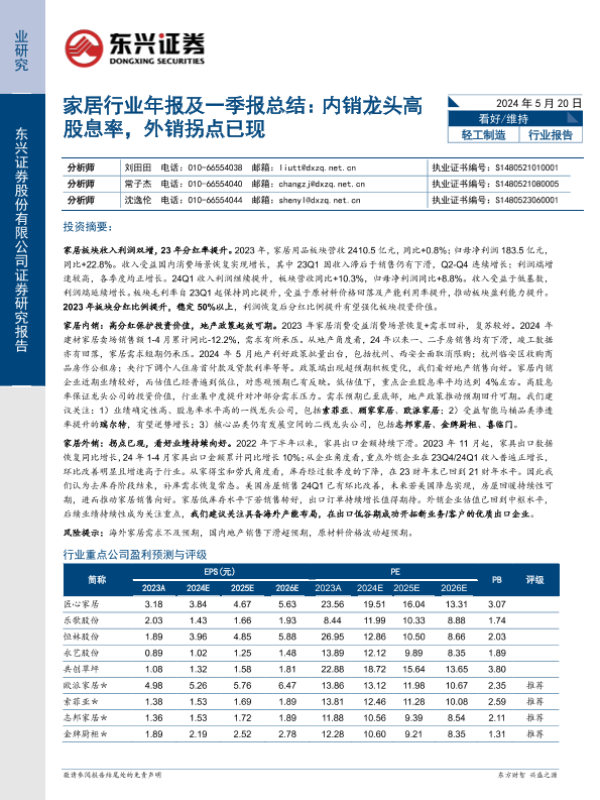 【东兴证券】【20240520】家居行业年报及一季报总结:内销龙头高股息率,外销拐点已现-15页 行业研究