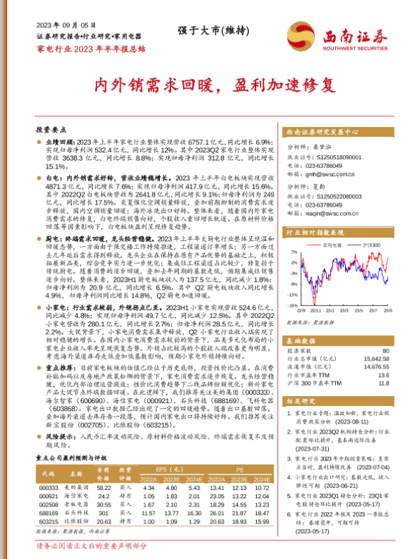 【西南证券】【20230905】家电行业2023年半年报总结:内外销需求回暖,盈利加速修复-21页 行业研究