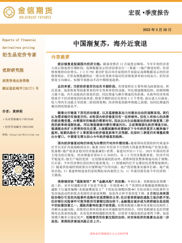 【金信期货】【20230326】宏观·季度报告:中国渐复苏,海外近衰退-24页 宏观策略