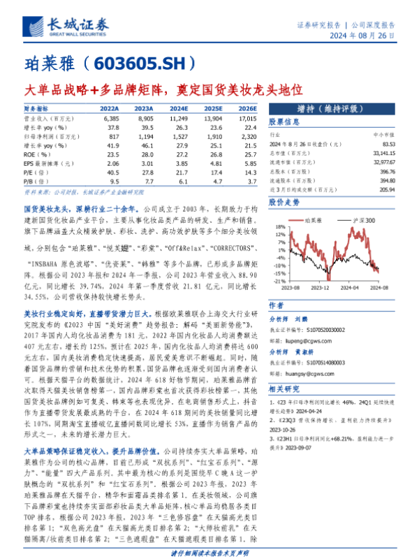 【长城证券】【20240826】珀莱雅:大单品战略+多品牌矩阵,奠定国货美妆龙头地位-22页 行业研究