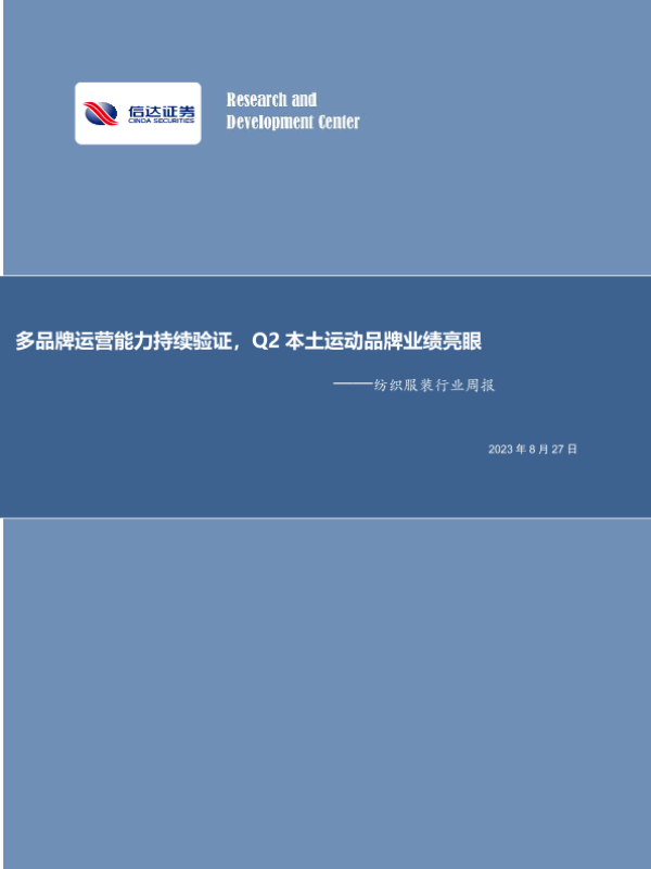 【信达证券】【20230827】20230827-信达证券-纺织服装行业周报:多品牌运营能力持续验证,Q2本土运动品牌业绩亮眼-13页 行业研究