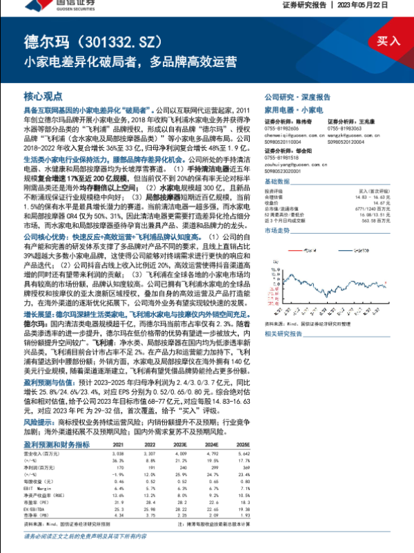 【国信证券】【20230522】德尔玛(301332)小家电差异化破局者,多品牌高效运营-49页 行业研究