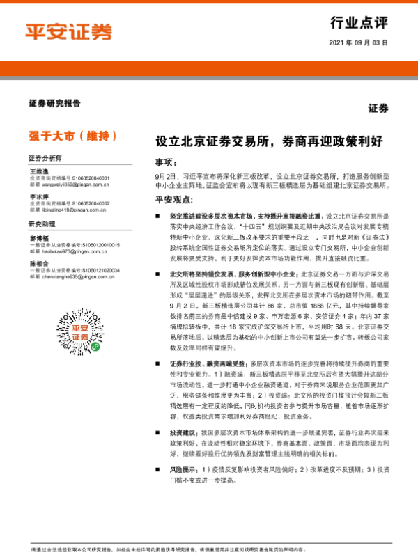 【平安证券】【20210903】设立北京证券交易所,券商再迎政策利好-3页 行业研究
