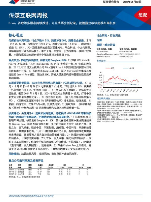 【国信证券】【20240102】Pika、谷歌等多模态持续推进、元旦档票房创纪录,把握游戏板块超跌布局机会-15页 行业研究