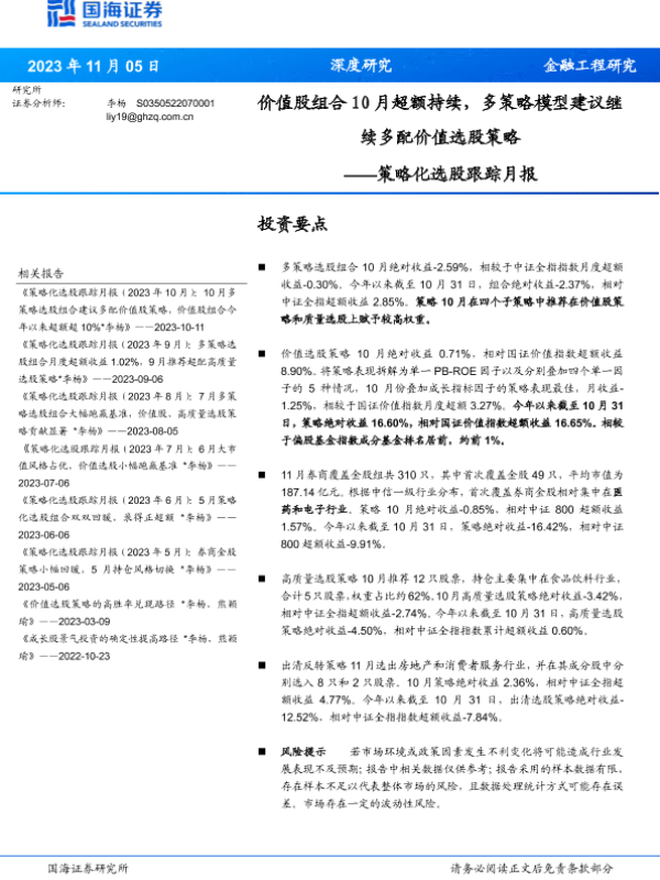 【国海证券】【20231105】策略化选股跟踪月报:价值股组合10月超额持续,多策略模型建议继续多配价值选股策略-27页 行业研究