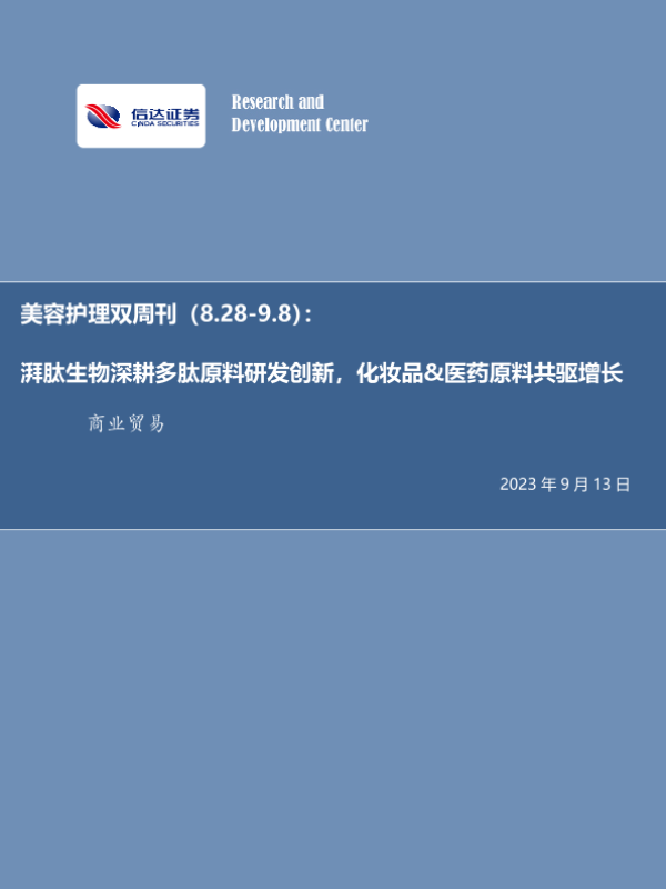 【信达证券】【20230913】美容护理双周刊:湃肽生物深耕多肽原料研发创新,化妆品&医药原料共驱增长-22页 行业研究