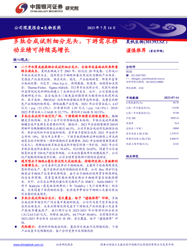 【银河证券】【20230714】昊帆生物-301393.SZ-多肽合成试剂细分龙头,下游需求推动业绩可持续高增长-40页 行业研究