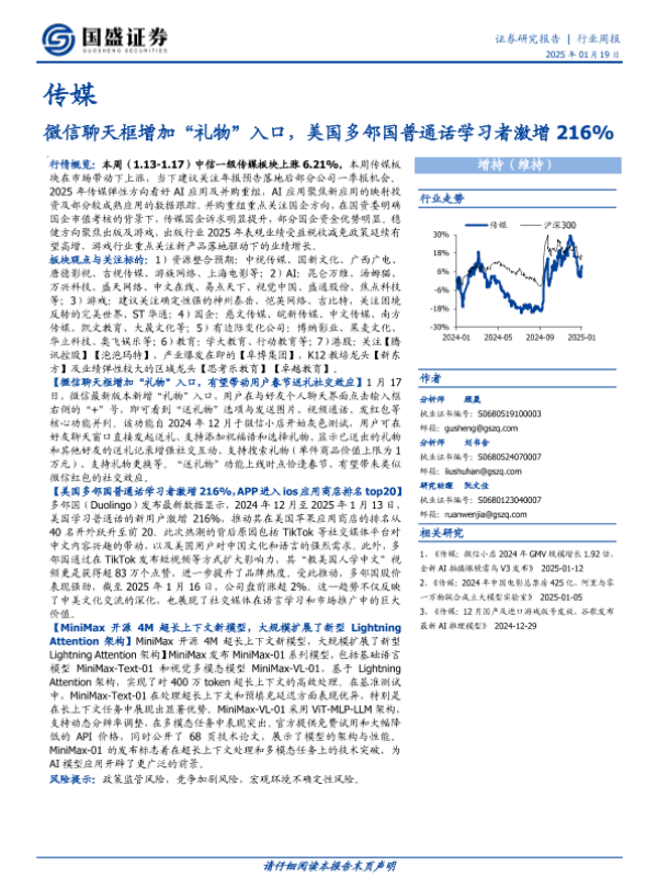 【国盛证券】【20250119】国盛证券-传媒行业周报:微信聊天框增加“礼物”入口,美国多邻国普通话学习者激增216%-10页 行业研究