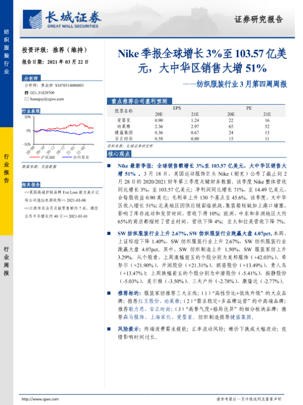 【长城证券】【20210322】20210322-长城证券-纺织服装行业3月第四周周报:Nike季报全球增长3%至103.57亿美元,大中华区销售大增51%-16页 行业研究