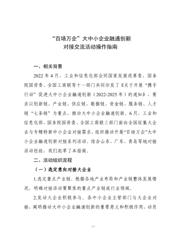 【工业和信息化部】【2022】“百场万企”大中小企业融通创新对接交流活动操作指南-9页 指南