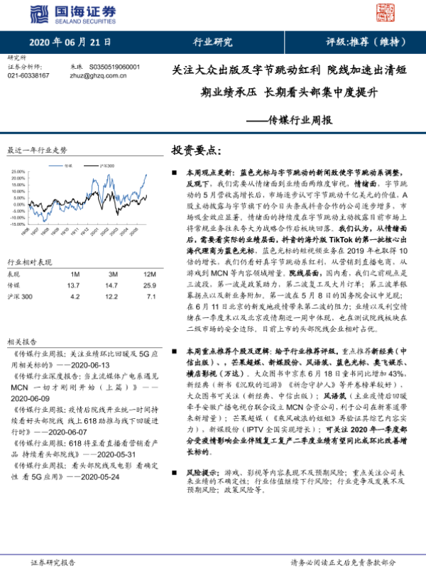 【国海证券】【20200621】传媒行业周报:关注大众出版及字节跳动红利 院线加速出清短期业绩承压 长期看头部集中度提升-18页 行业研究